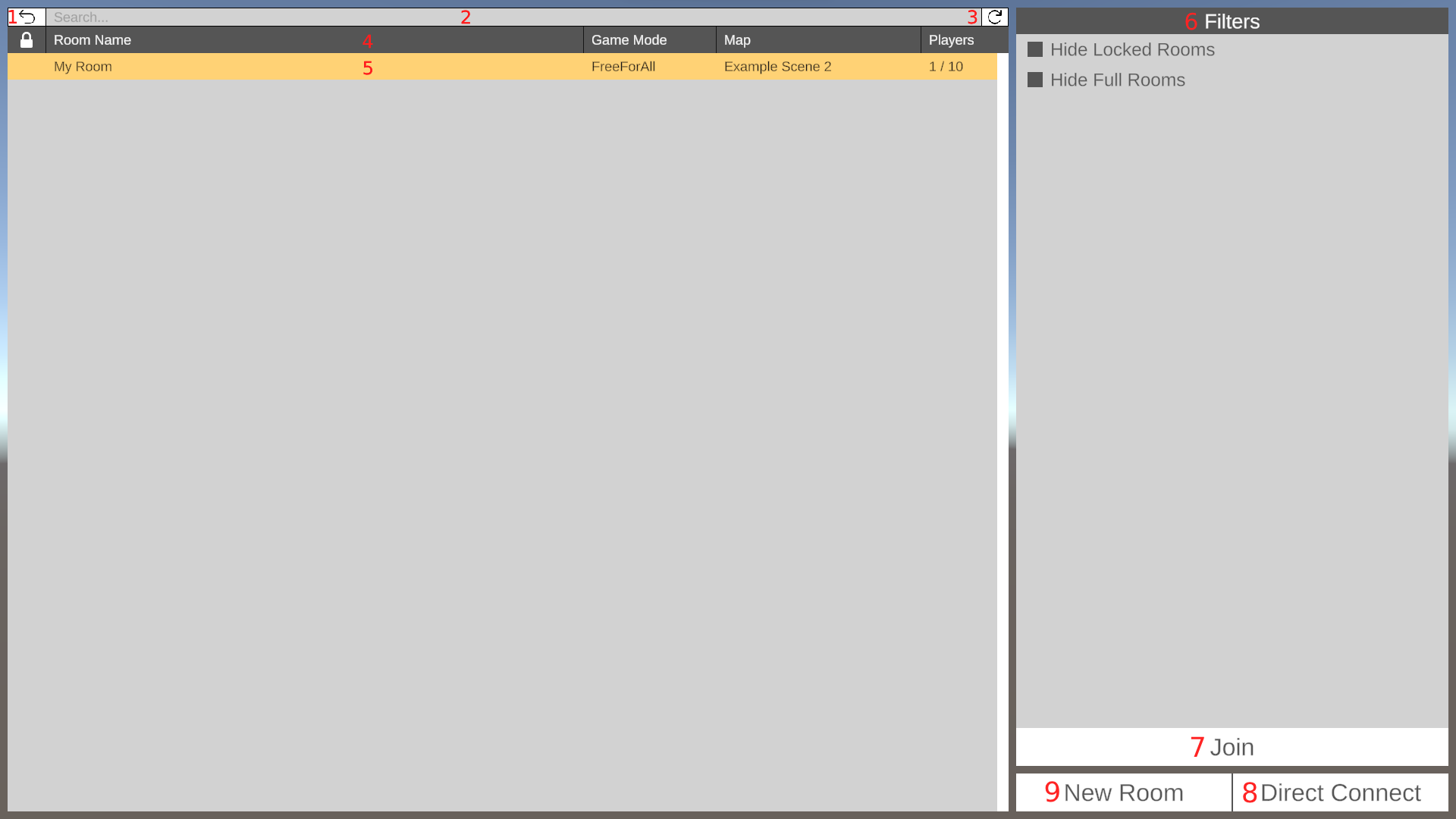 - The Join/Leave button: If not in a room when pressing the button joins the selected room. Disabled if no room is selected. When in a room the button will change text to Leave. Leaves the current room when pressed.