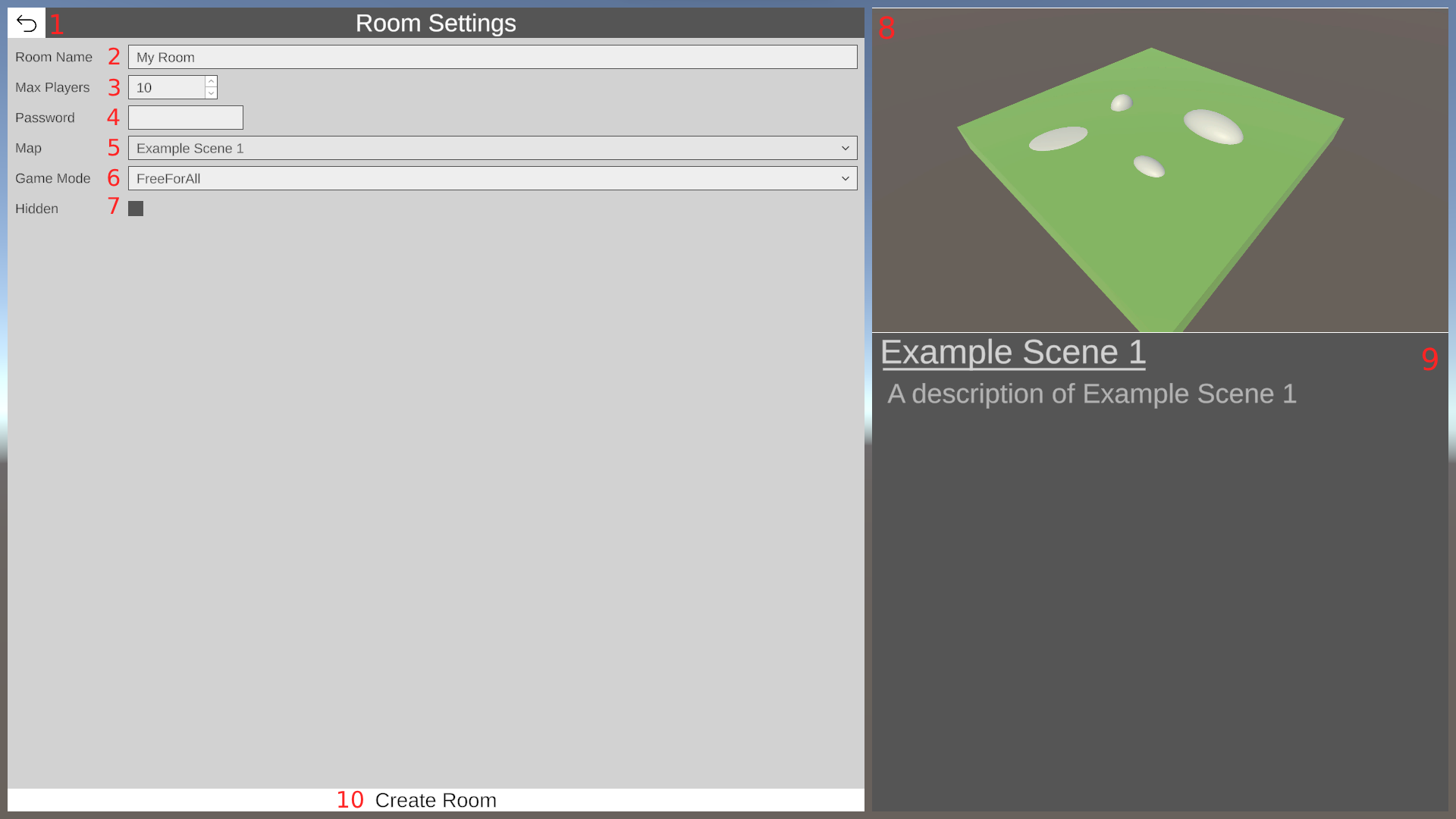 - Max Players: How many players can join the room. Max value is limited to the value of Max Players in the Multiplayer Component.