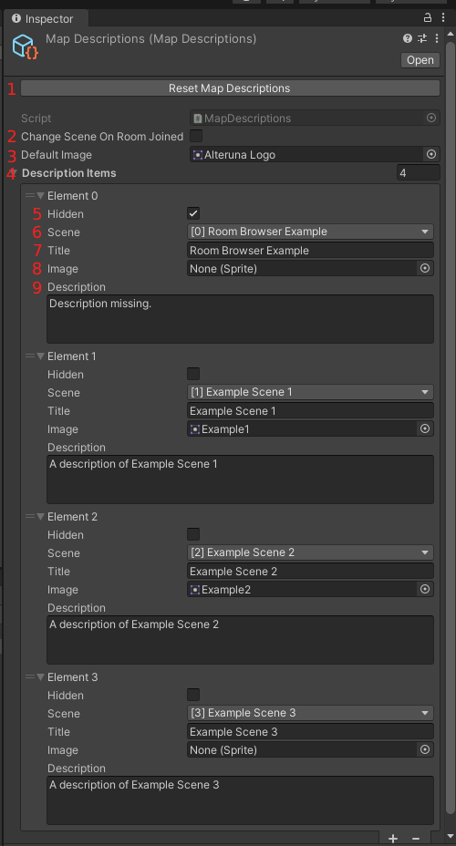- Map: Select what scene to load when the room is joined. The options available are defined in the MapDescriptions file.